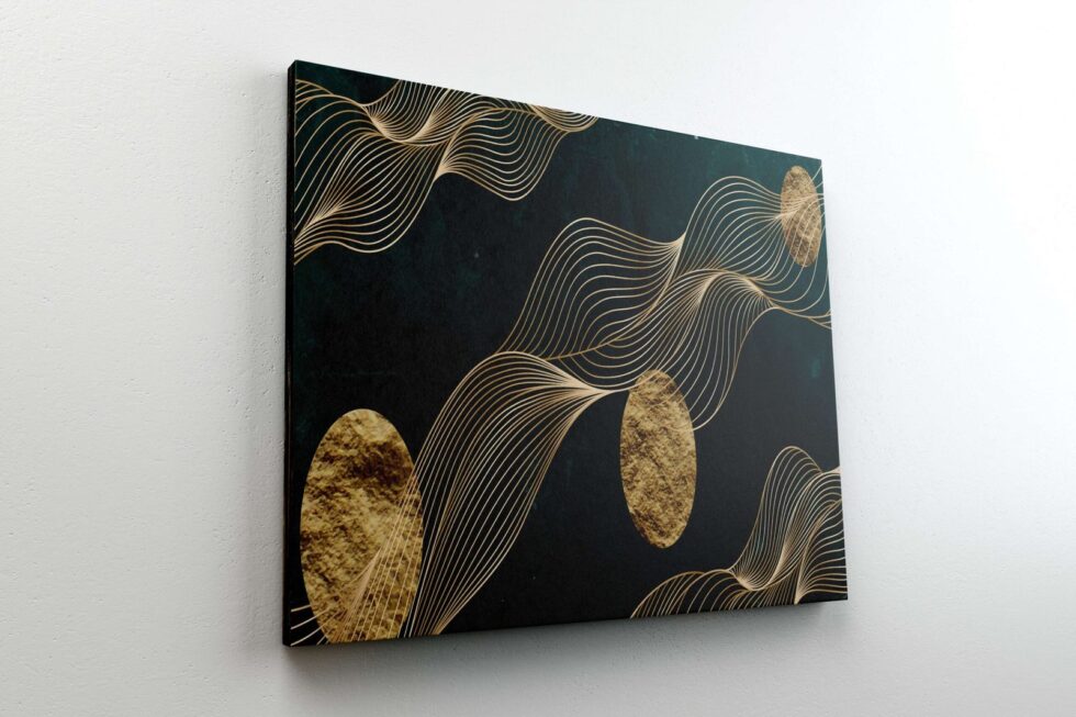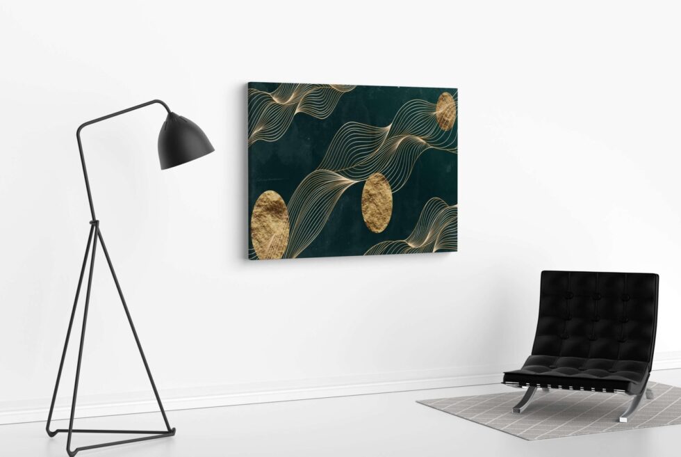 Elegant artwork in a golden round frame, a beautiful addition to your home office.