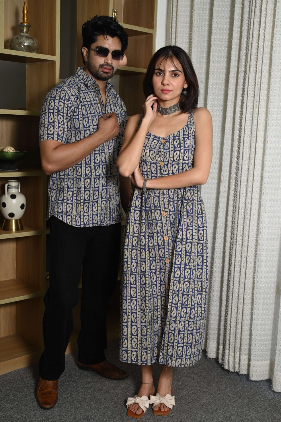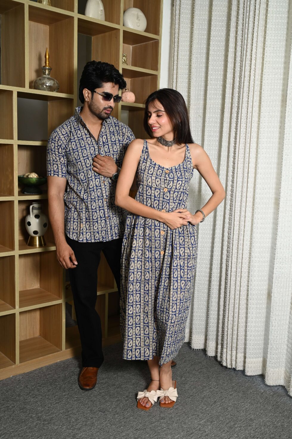 Step out in style with this charming couple matching outfit featuring a printed cotton dress for women and a coordinated short-sleeve shirt for men. Crafted from breathable cotton, this set is perfect for casual outings, vacations, parties, and pre-wedding shoots. The elegant floral-inspired print adds a touch of romance, while the soft fabric ensures all-day comfort. Pair the women?s midi dress with sandals or heels and the men?s shirt with trousers or chinos for a perfectly coordinated couple look.