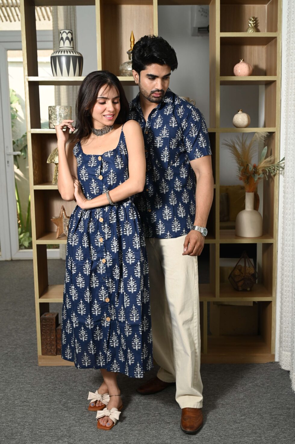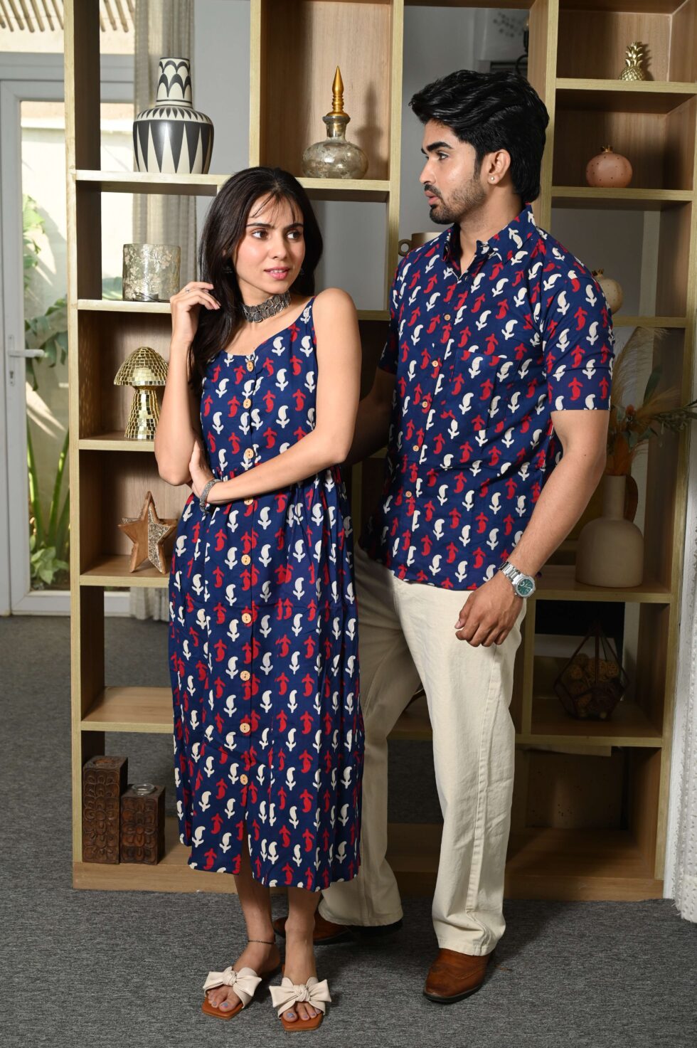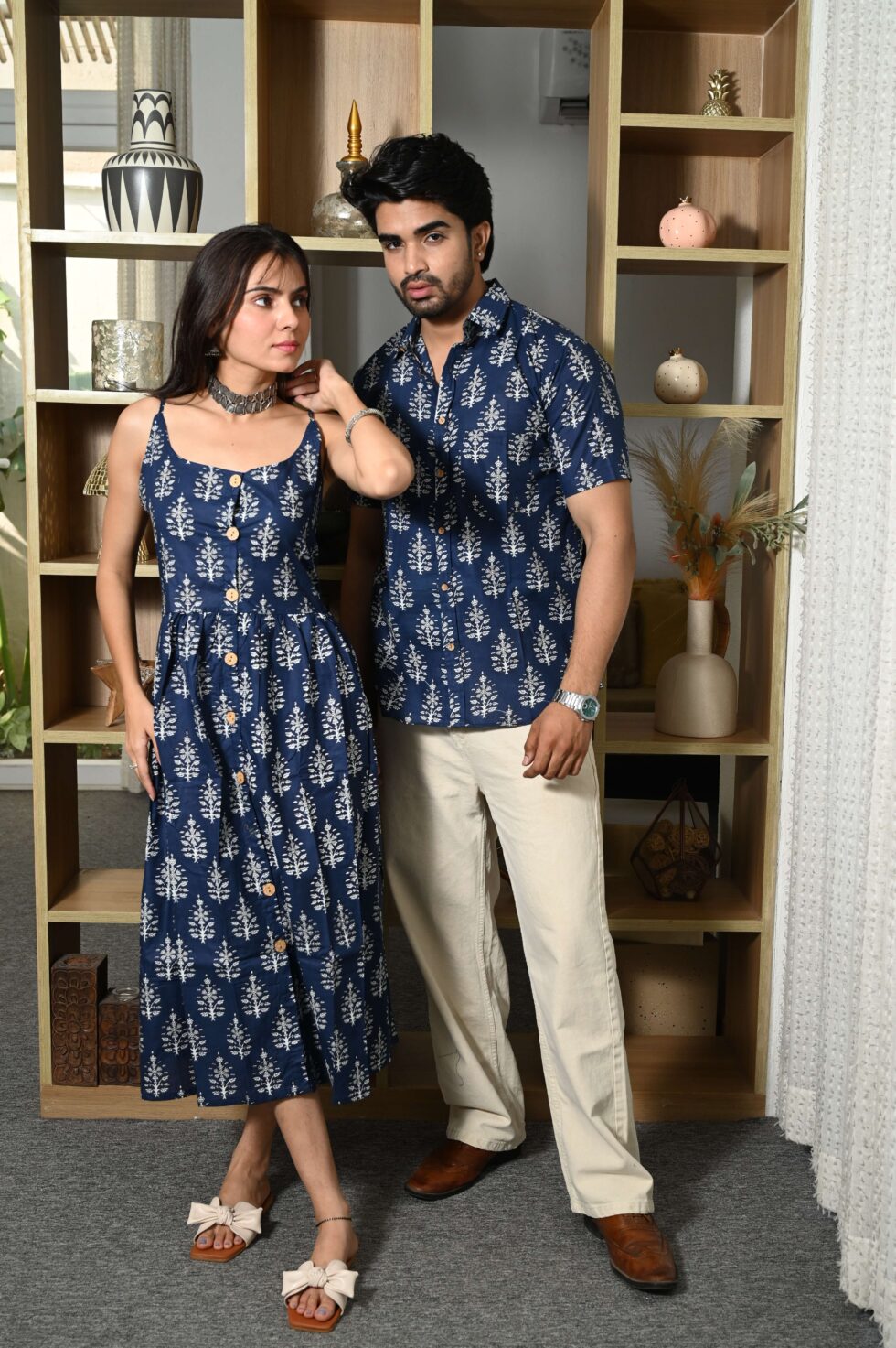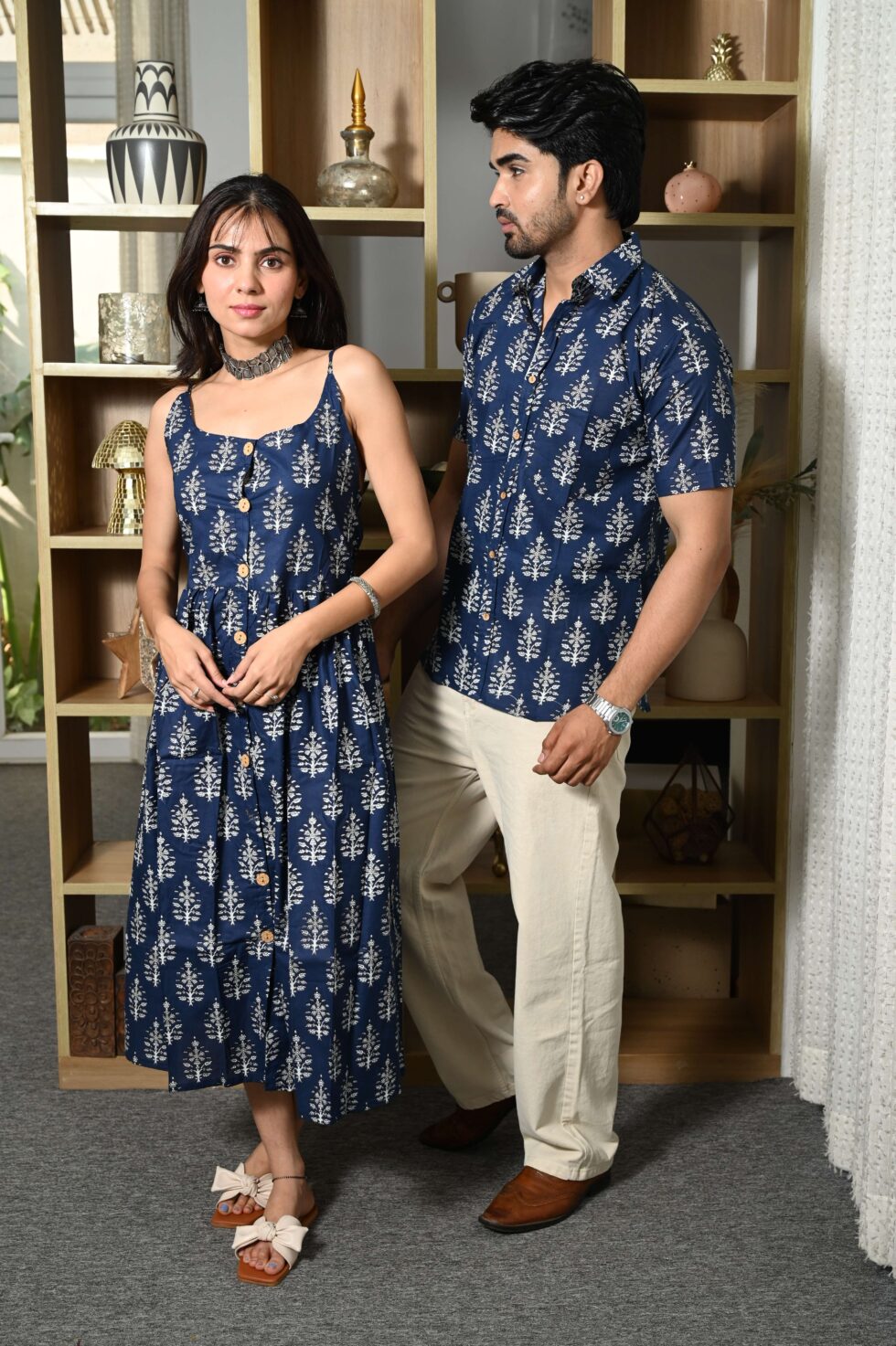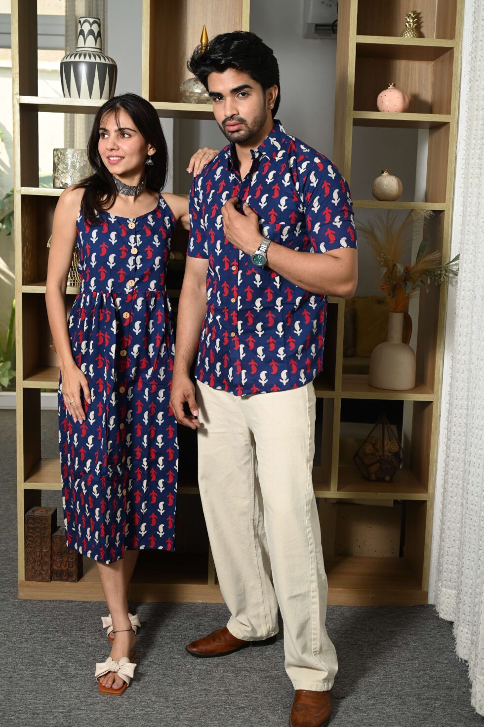 Step out in style with this charming couple matching outfit featuring a printed cotton dress for women and a coordinated short-sleeve shirt for men. Crafted from breathable cotton, this set is perfect for casual outings, vacations, parties, and pre-wedding shoots. The elegant floral-inspired print adds a touch of romance, while the soft fabric ensures all-day comfort. Pair the women?s midi dress with sandals or heels and the men?s shirt with trousers or chinos for a perfectly coordinated couple look.