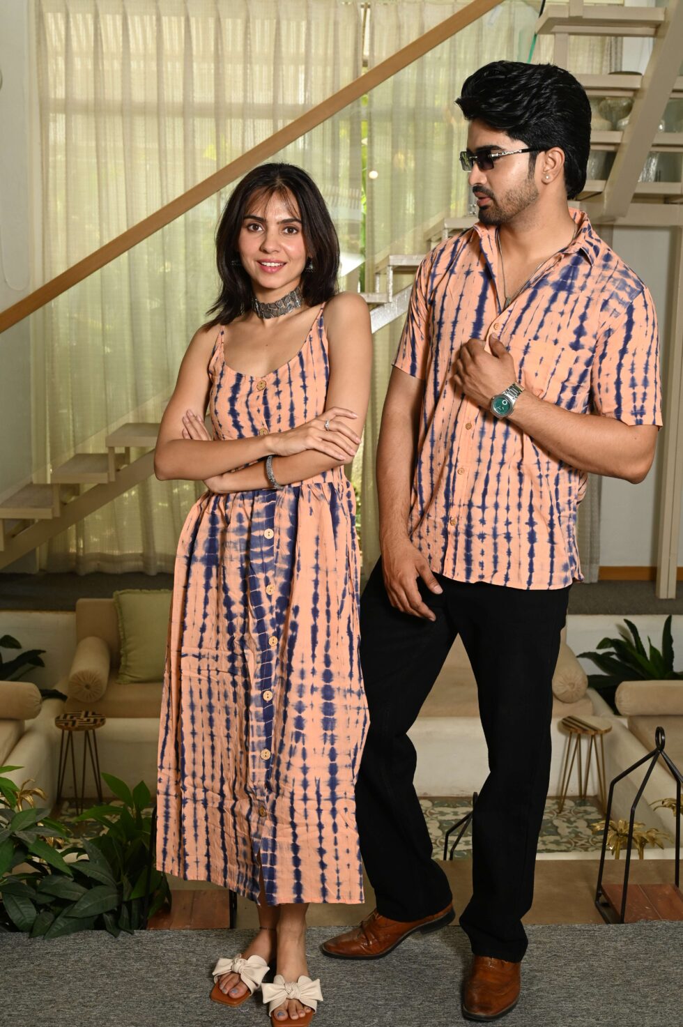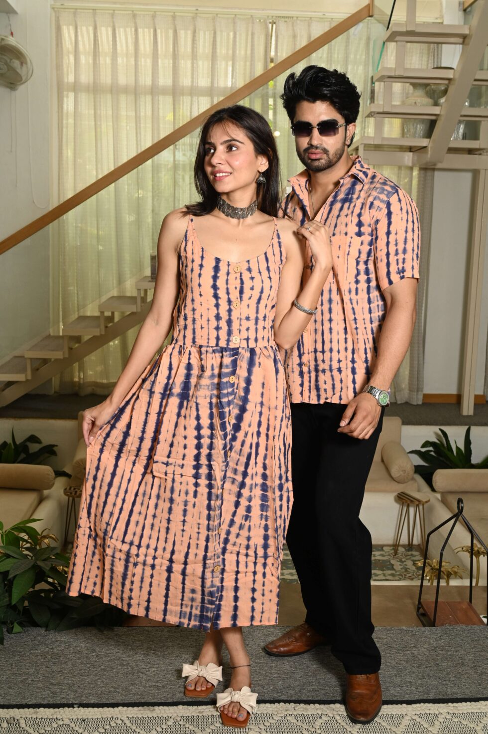 Step out in style with this charming couple matching outfit featuring a printed cotton dress for women and a coordinated short-sleeve shirt for men. Crafted from breathable cotton, this set is perfect for casual outings, vacations, parties, and pre-wedding shoots. The elegant floral-inspired print adds a touch of romance, while the soft fabric ensures all-day comfort. Pair the women?s midi dress with sandals or heels and the men?s shirt with trousers or chinos for a perfectly coordinated couple look.
