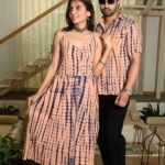 Charming couple matching outfit featuring a floral-inspired cotton dress for women and a coordinated short-sleeve shirt for men. Made from breathable cotton, perfect for vacations, parties, casual outings, and pre-wedding shoots.
