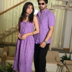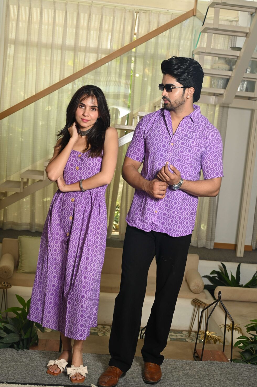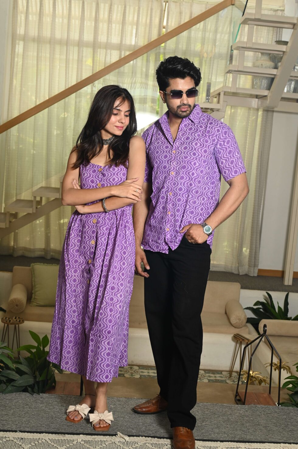 Couple Matching Outfit ? Purple Cotton Printed Midi Dress & Shirt Set, Stylish Summer Wear