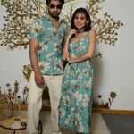 Charming couple matching outfit featuring a floral-inspired cotton dress for women and a coordinated short-sleeve shirt for men. Made from breathable cotton, perfect for vacations, parties, casual outings, and pre-wedding shoots.
