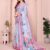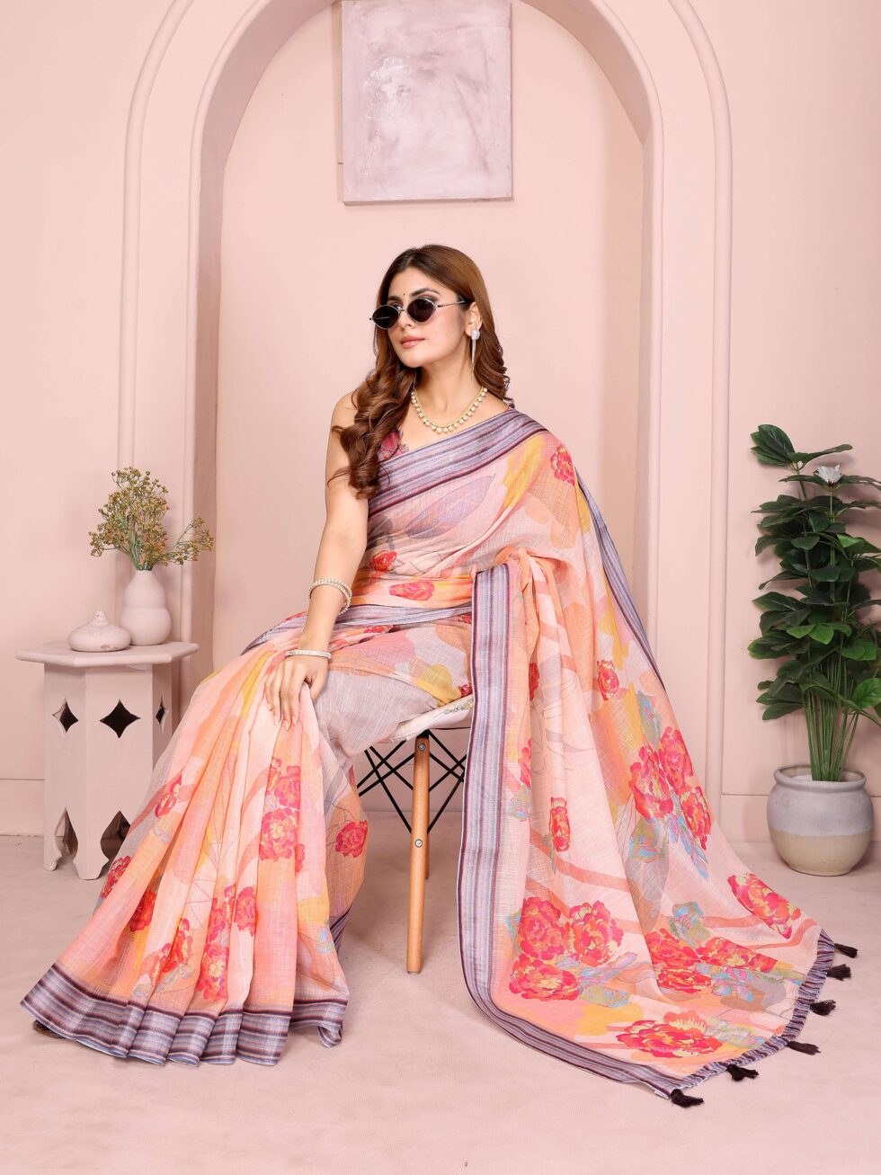 Bright and cheerful, this peach linen cotton saree features bold floral prints, a navy-grey striped border with black tassels, and a matching blouse piece ? perfect for festive, casual, or office wear.