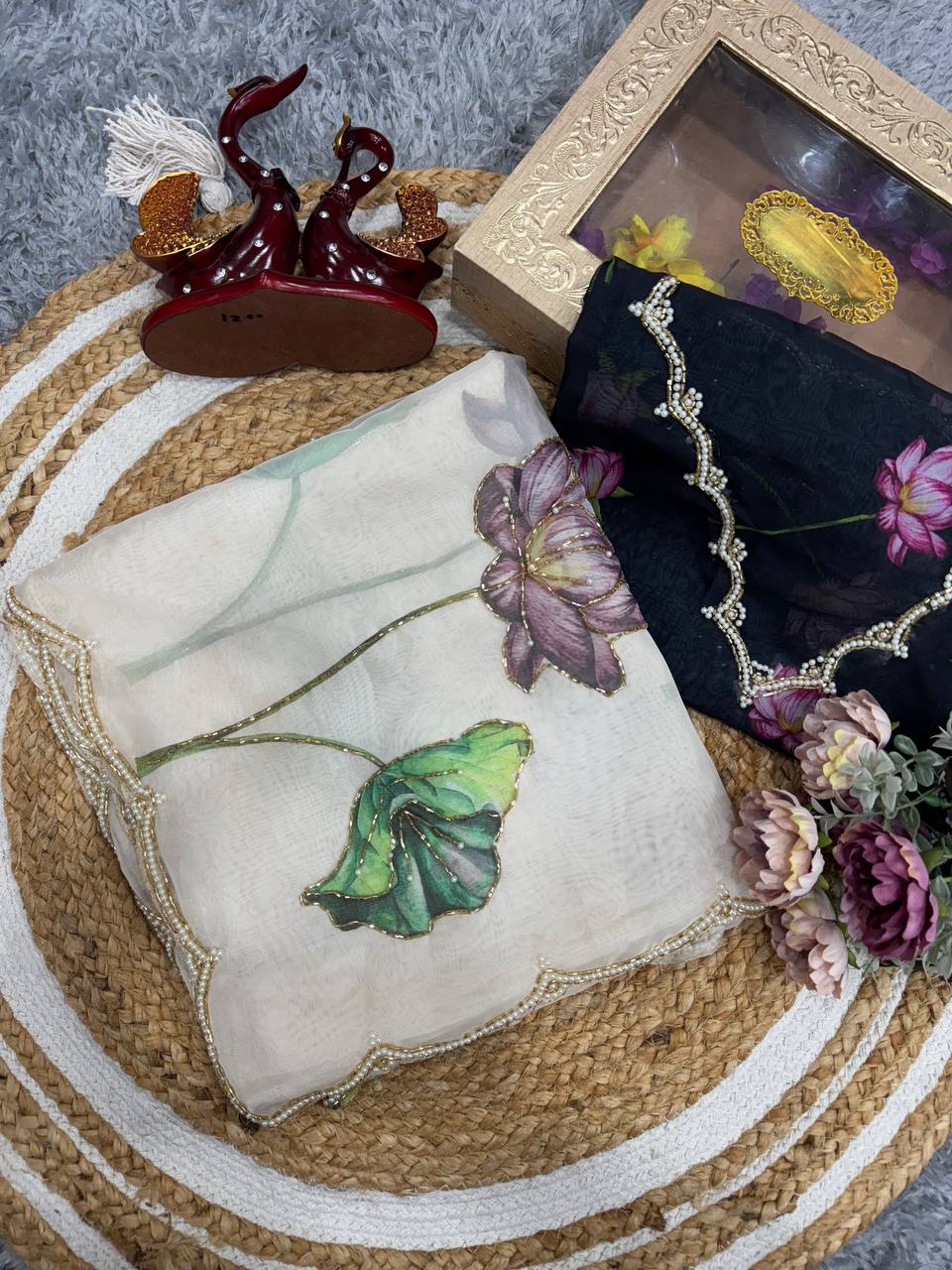Soft Organza Saree with floral print, beads, and katdana handwork. Includes matching printed blouse. Priced at ₹5,399.00.