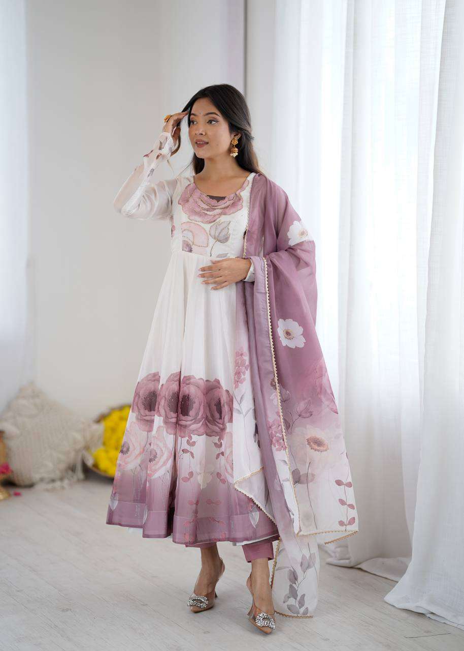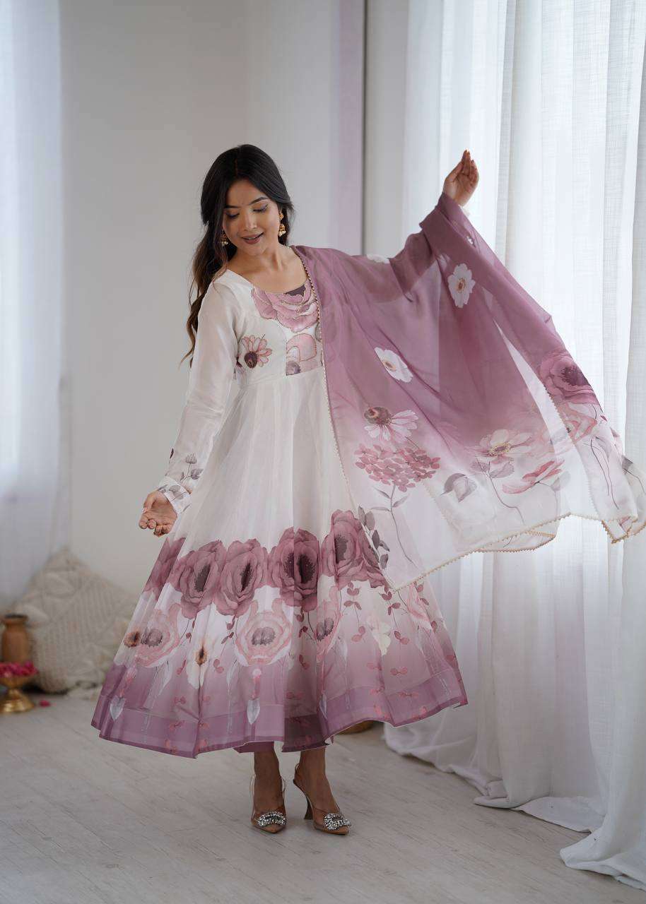 Womens Pure Romansilk Chanderi Floral Printed Anarkali Kurti With Dupatta & Pant Set