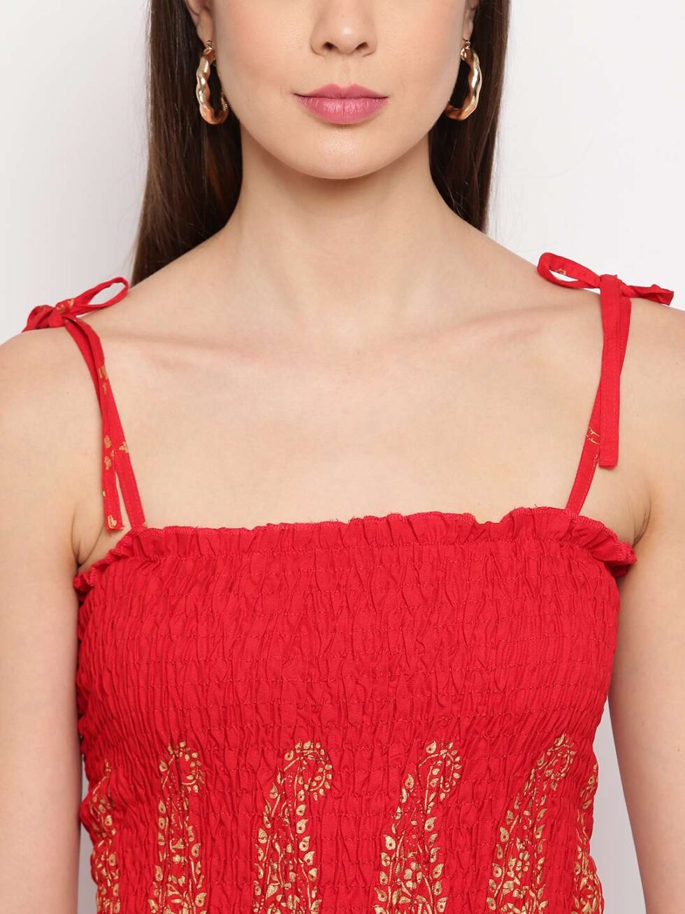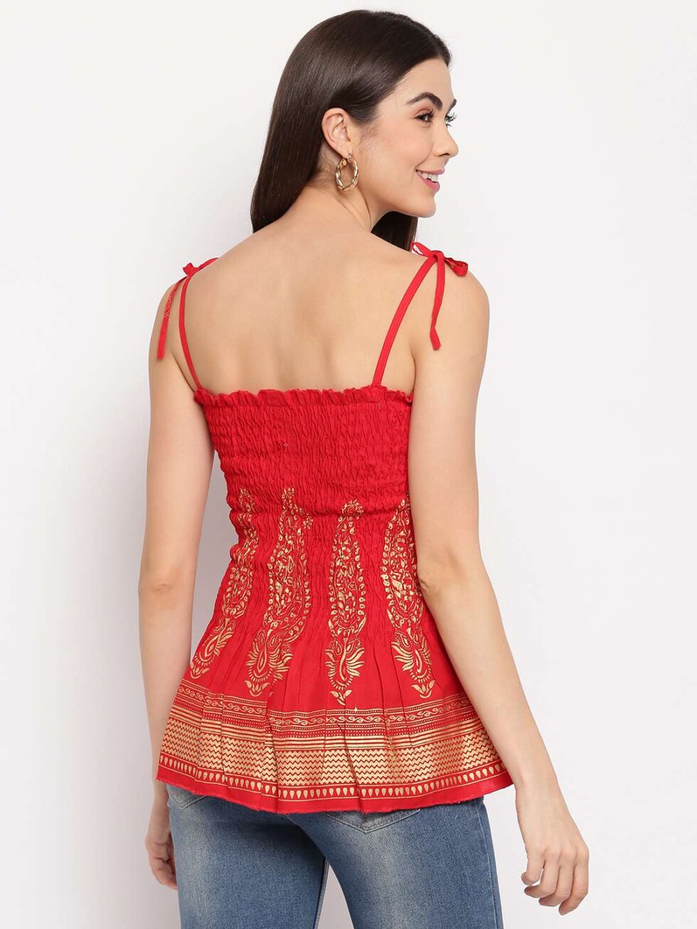 Women’s Rayon Buta Printed Casual Summer Style Tie Shoulder Straps Free Size Tank Top ( Red Gold Pattern)