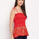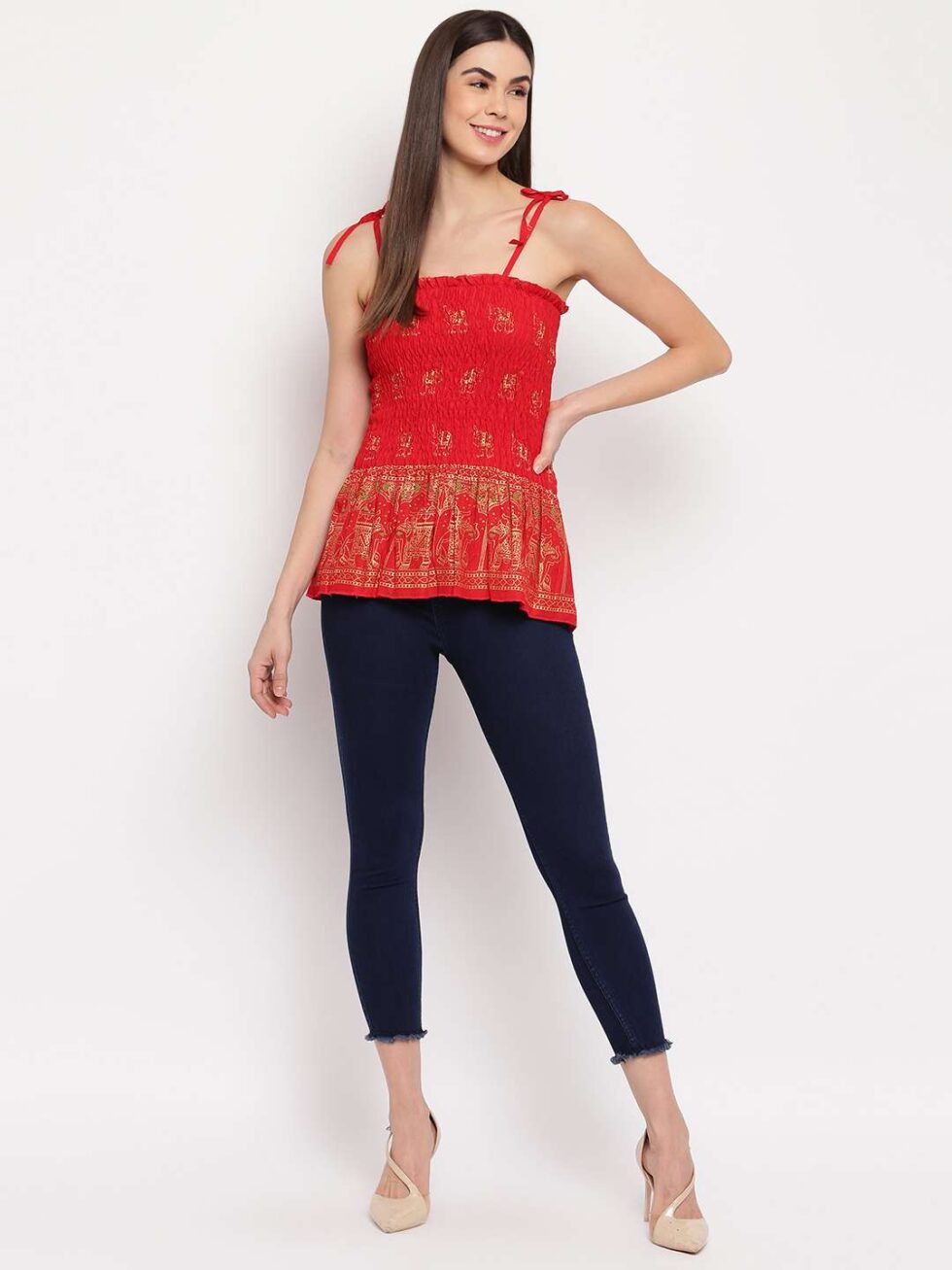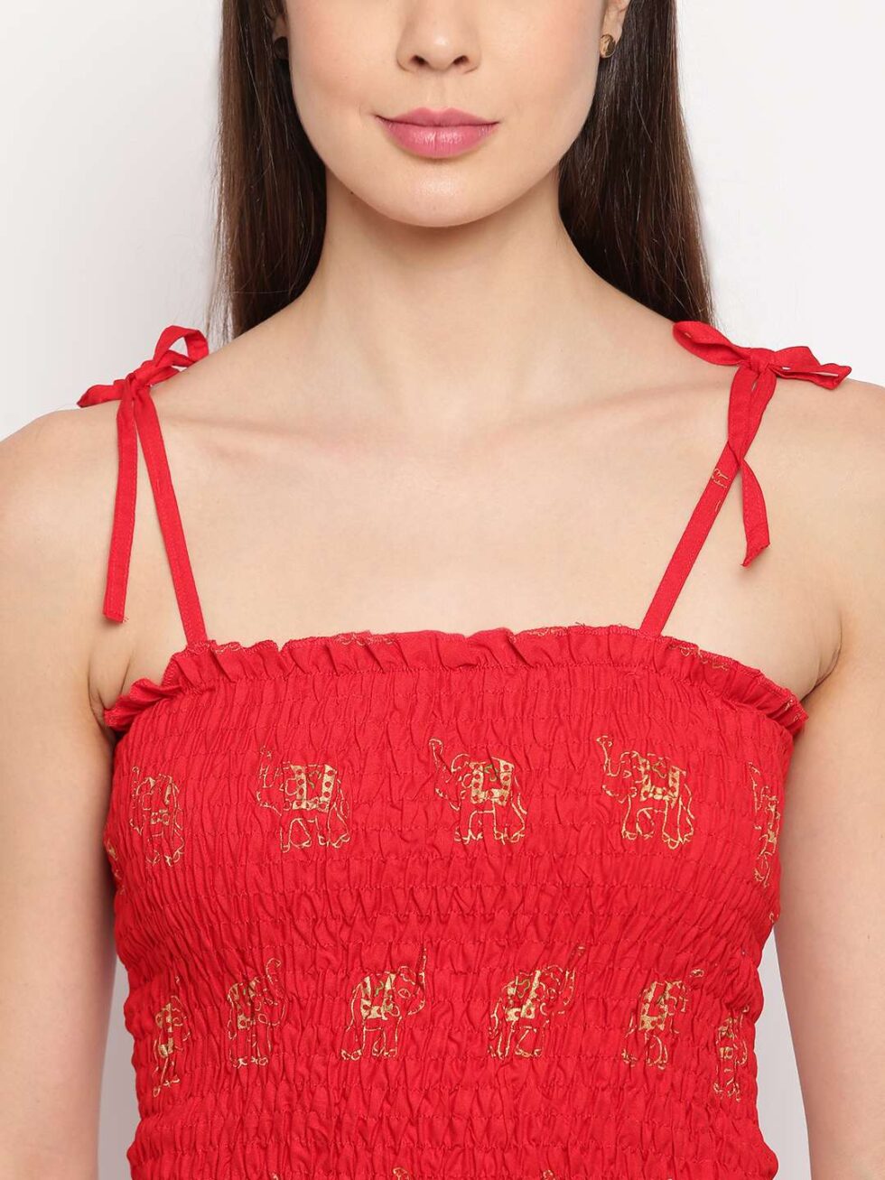 Women’s Rayon Elephant Print Casual Summer Style Tie Shoulder Straps Free Size Tank Top ( Red Gold Pattern)